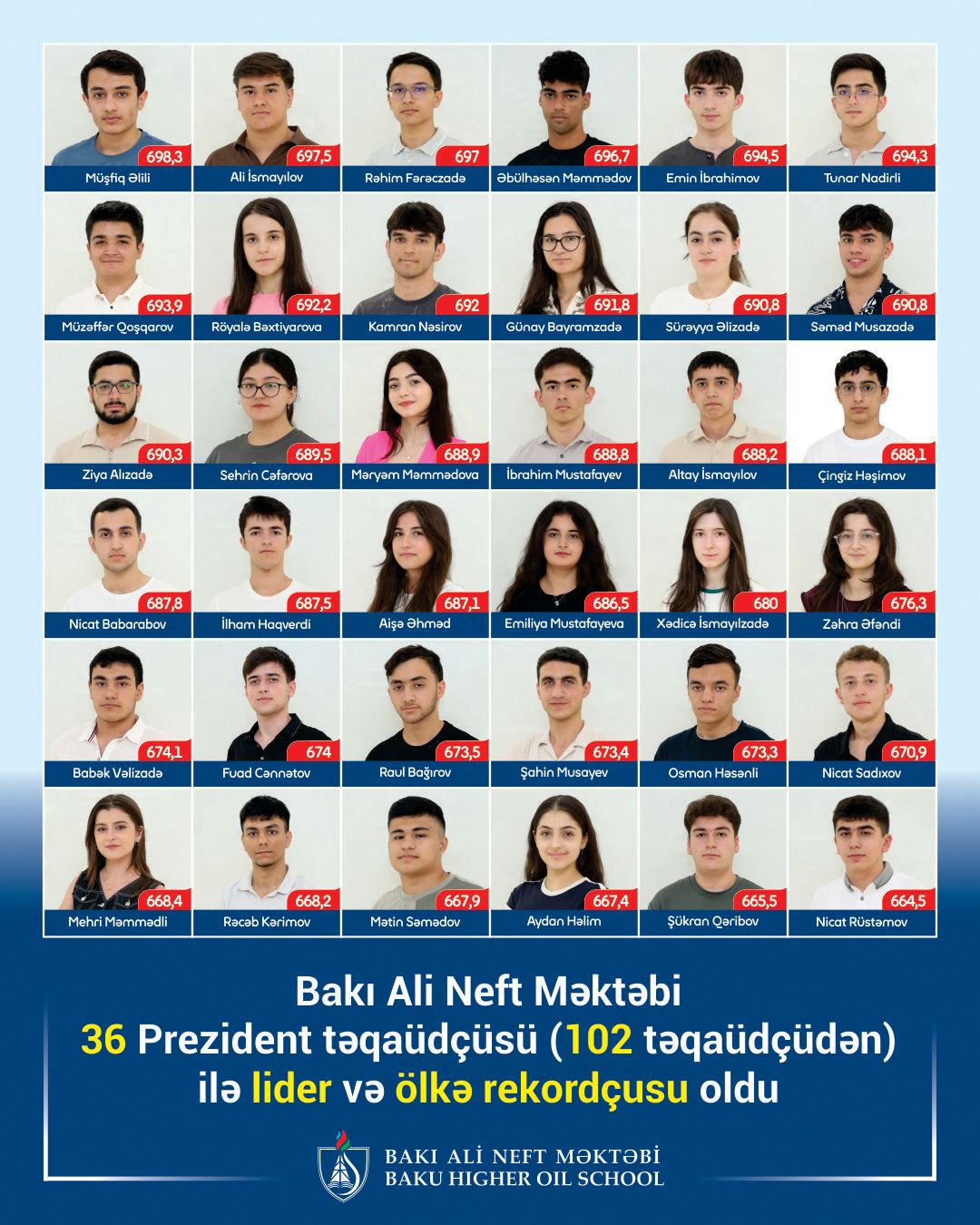 Azərbaycan Prezidenti cənab İlham Əliyevin “2025-2026-cı tədris ilində Azərbaycan Respublikasının ali məktəblərinə daxil olmuş tələbələrə Prezident təqaüdünün verilməsi haqqında müvafiq Sərəncamına əsasən, Prezident təqaüdünə layiq görülmüş tələbələrin 36 nəfəri SOCAR-ın Bakı Ali Neft Məktəbində (BANM) təhsil alır.
